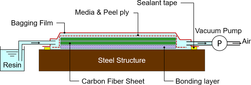 - 1Attach the carbon fiber sheets on the steel structure with a strong adhesive, and put them in a bagging film.