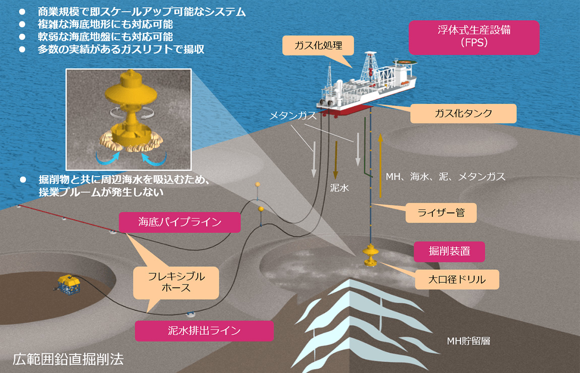 この広範囲鉛直採掘方式は、船上から吊り降ろした大口径ドリルで掘削する手法で、以下のメリットがあります。