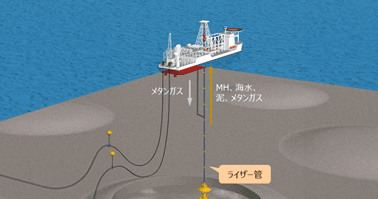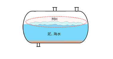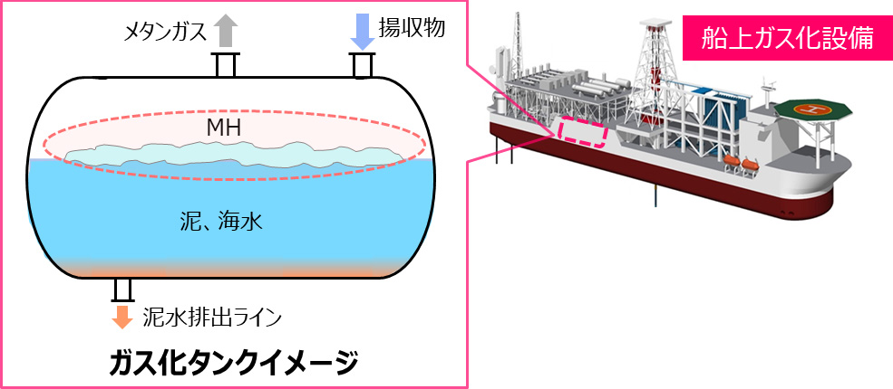 船上には海水、メタンハイドレート(MH)、泥、メタンガスが揚収されます。揚収したメタンハイドレートは密閉されたガス化タンク内で加熱することによって分解し、メタンガスのみをタンク外に取り出します。
