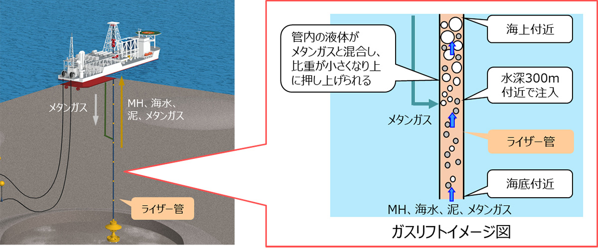 表層型メタンハイドレートの揚収技術として採用するガスリフト方式は、ライザー管に圧縮されたガスを注入することで、海底から揚収物を船上に揚げる方式です。さらに、表層型MHを揚収する場合は、ライザー管の中でMHが分解・ガス化して自ずからガスリフト効果が生じますので、より効率的に揚収が行えます。また、海中に揚収機器を配置しないため、メンテナンス性は良く、故障時の対応も容易となります。